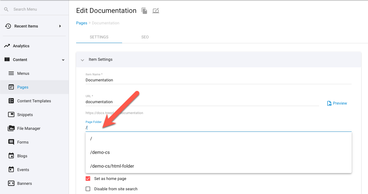 To assign an existing Page to a folder, edit the Page details and select the desired folder from the “Page Folder” field.