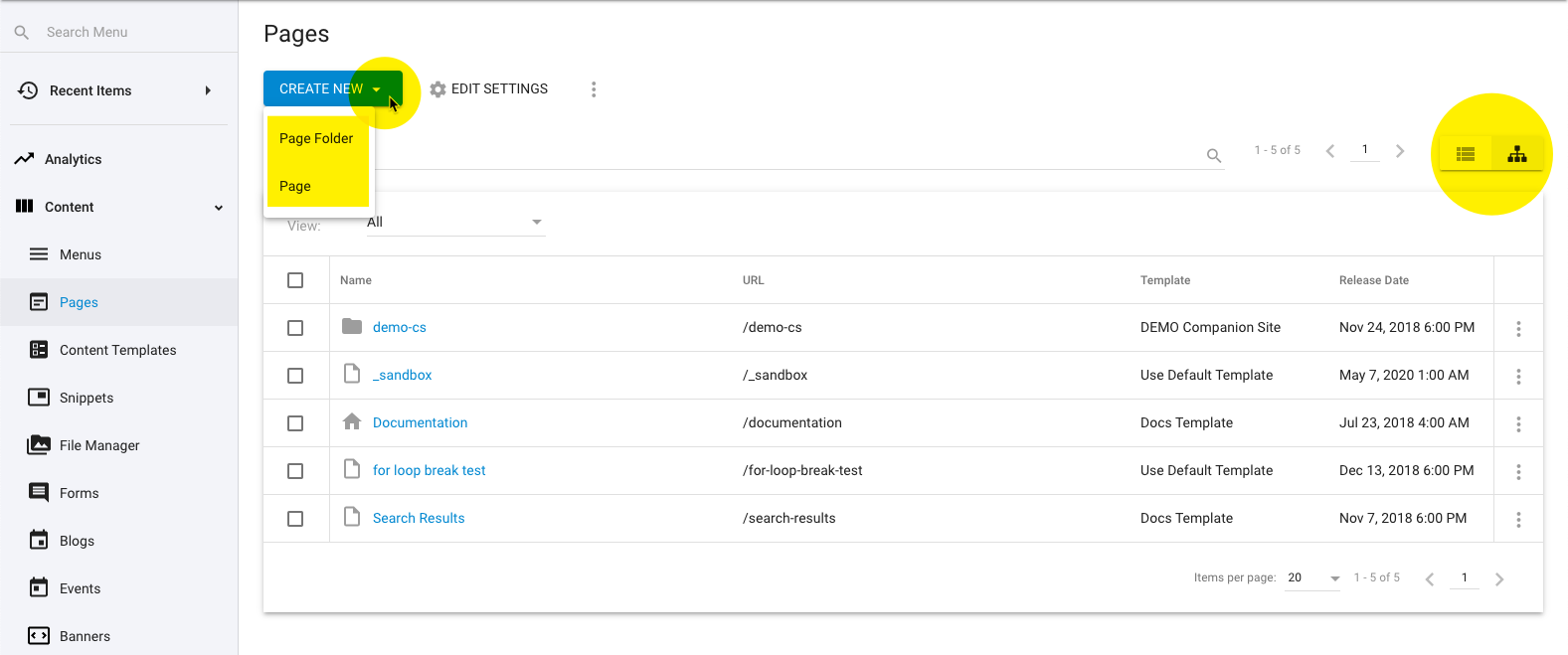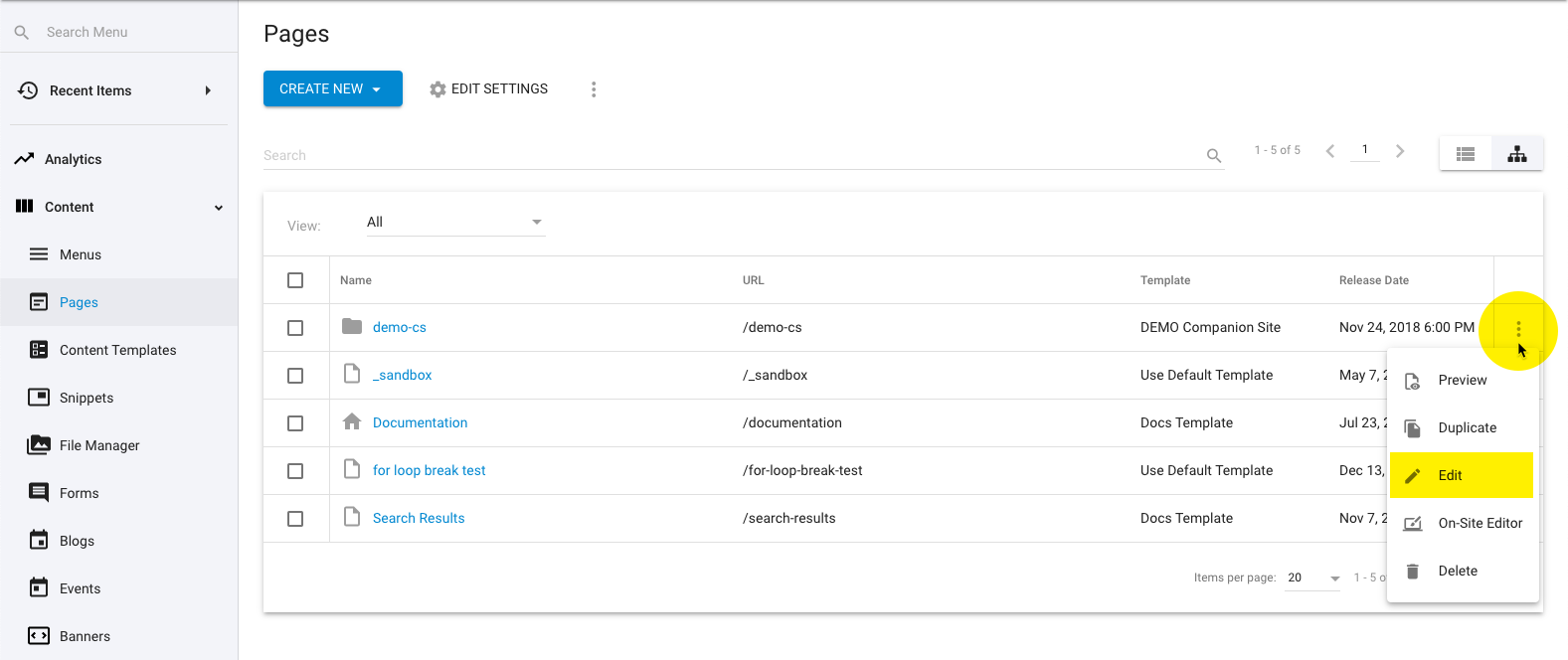 From the Pages item list view, click the “CREATE NEW” button at the top to start creating a new item or click directly on the name of any existing item in the list.
